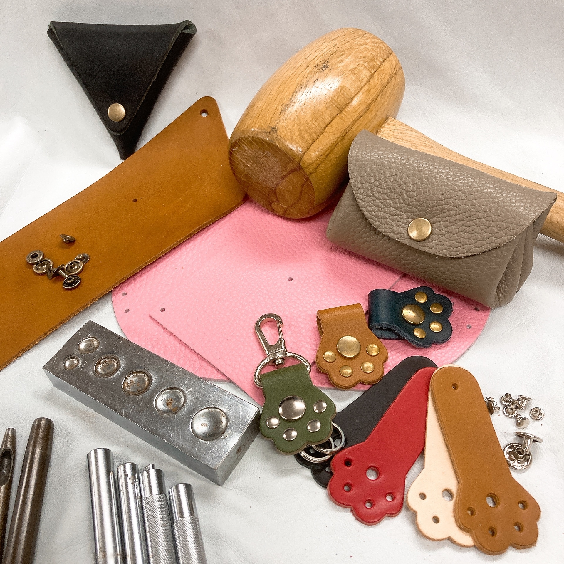 作れる革小物は「アコーディオンポーチ」「三角コインケース」など当店定番の人気レザーキットを複数ご用意