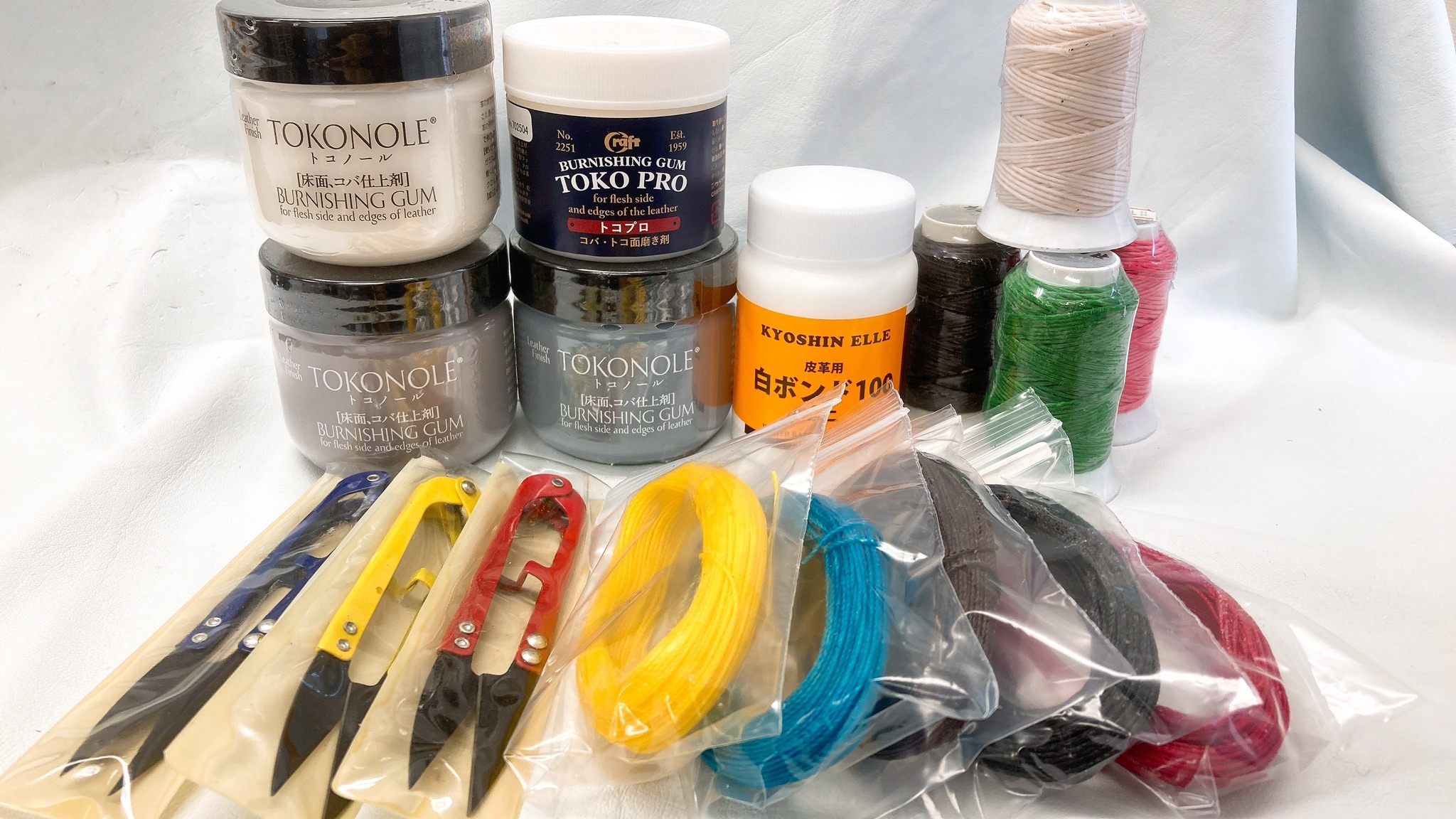 トコノール(120g) / トコプロ(100g) / 白ボンド(100cc) / 2代目鬼のように切れる糸切りバサミ / お好みの手縫い糸