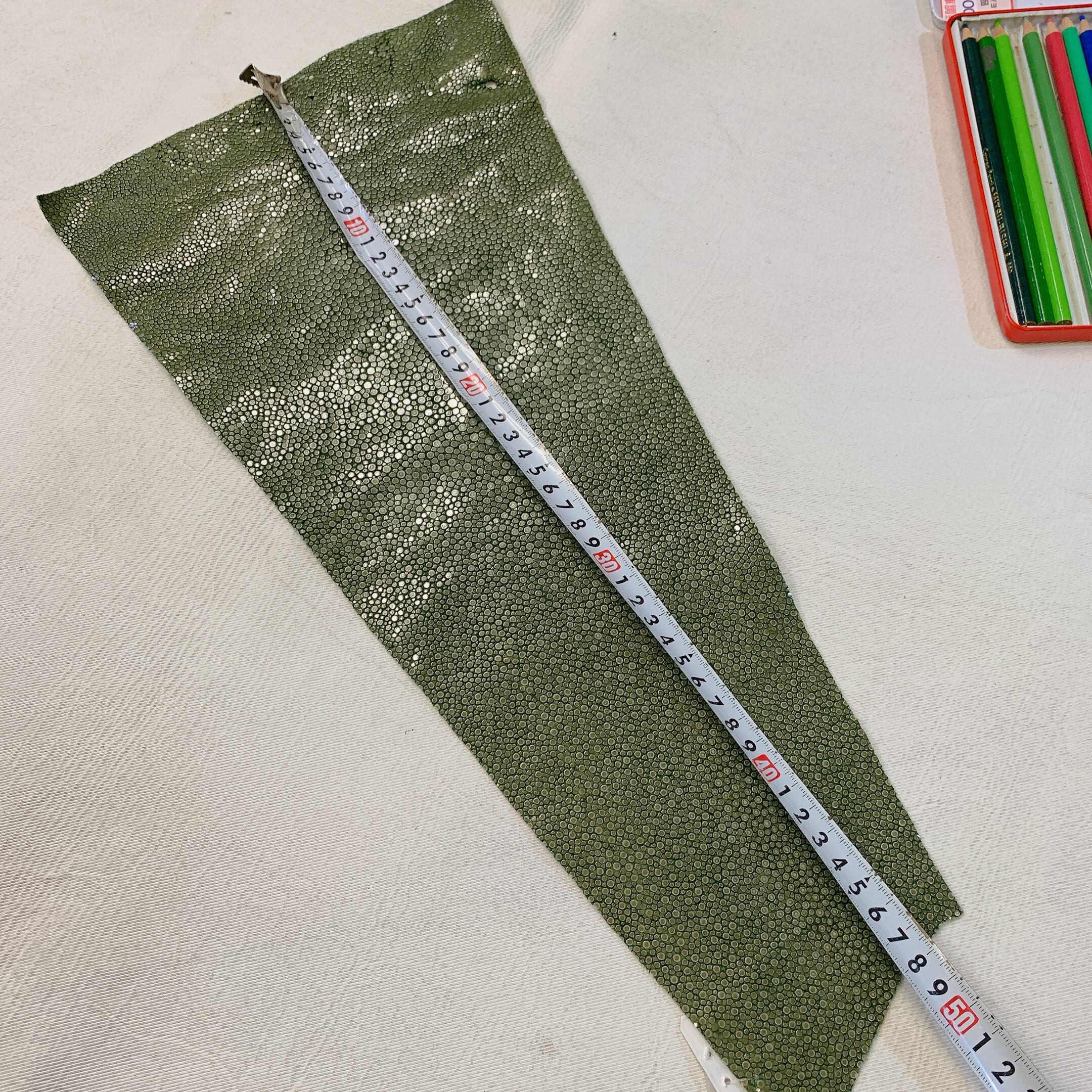 エイ革を含むエキゾチックレザー全般は、牛革や豚革と比べて凹凸が強く、生体由来の小傷や穴、鱗の裏の薄い箇所など、裂けやすい部分が含まれることがございます。