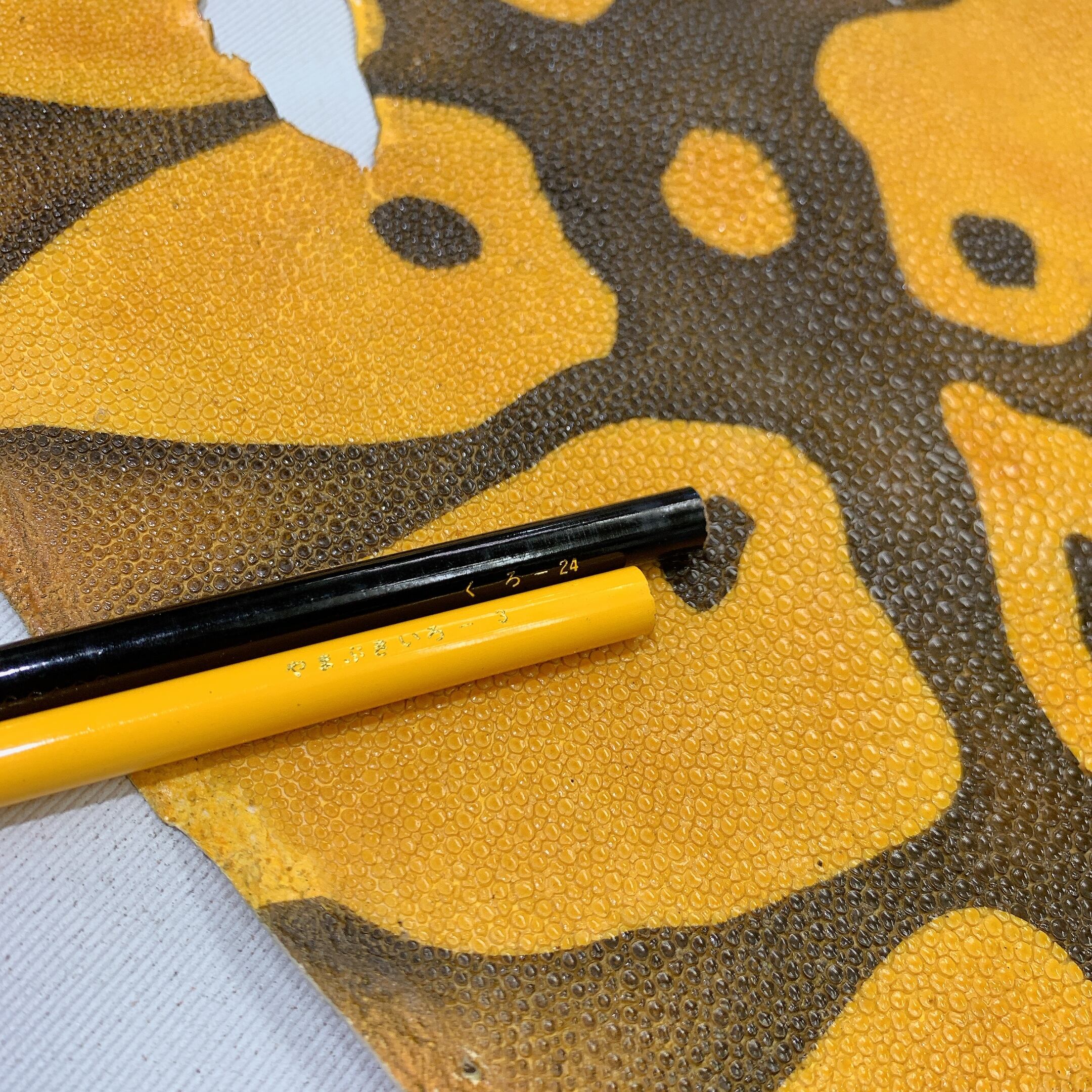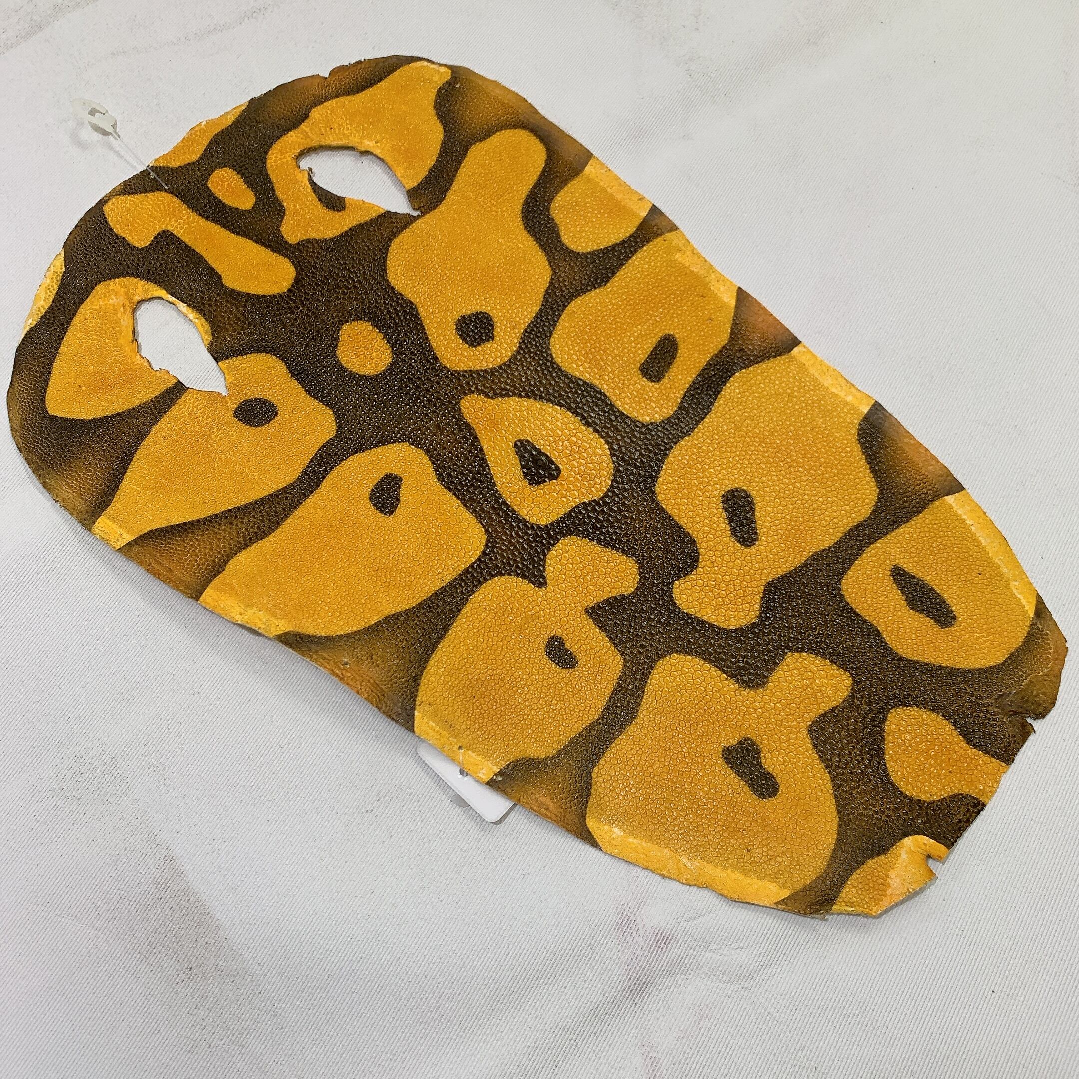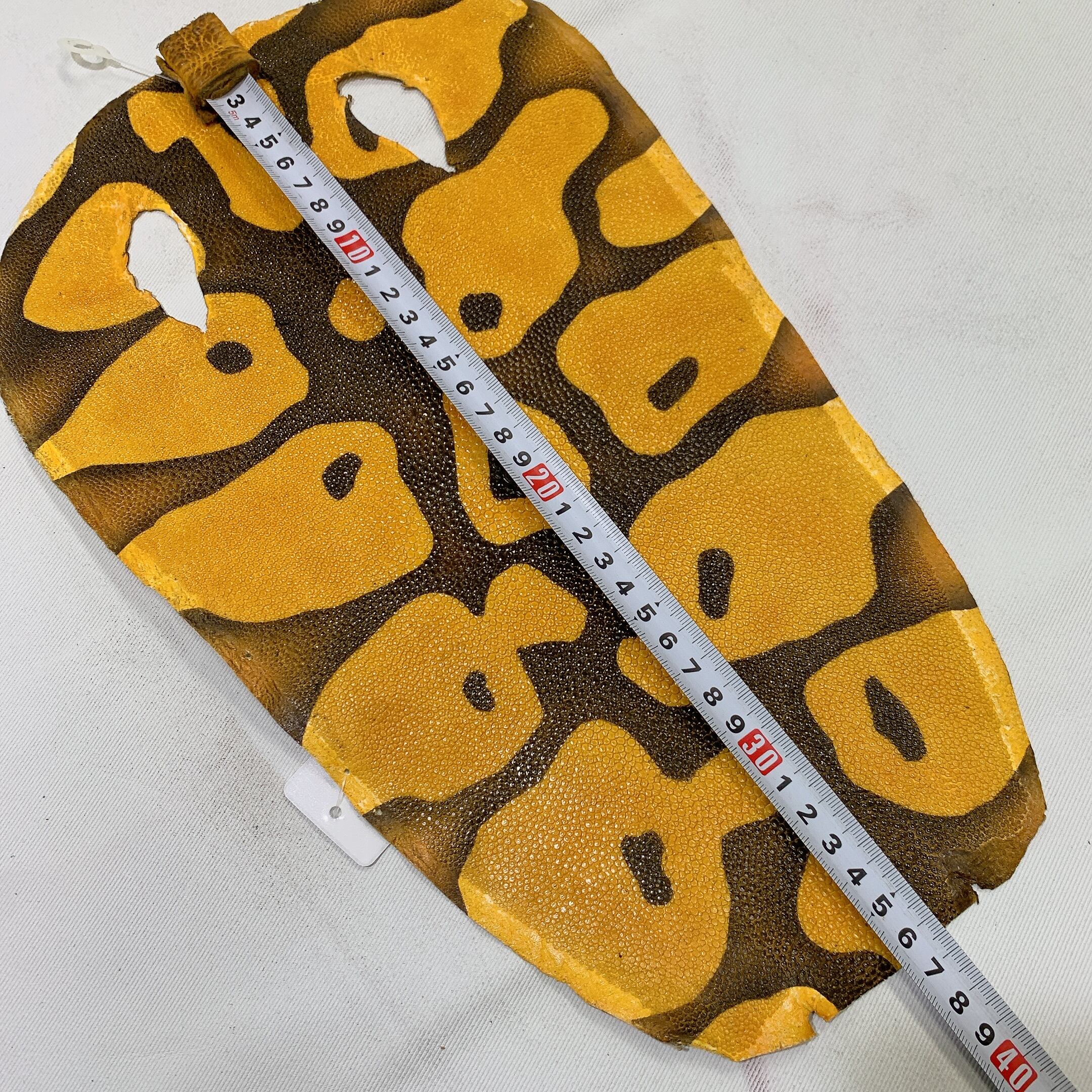 エイ革を含むエキゾチックレザー全般は、牛革や豚革と比べて凹凸が強く、生体由来の小傷や穴、鱗の裏の薄い箇所など、裂けやすい部分が含まれることがございます。