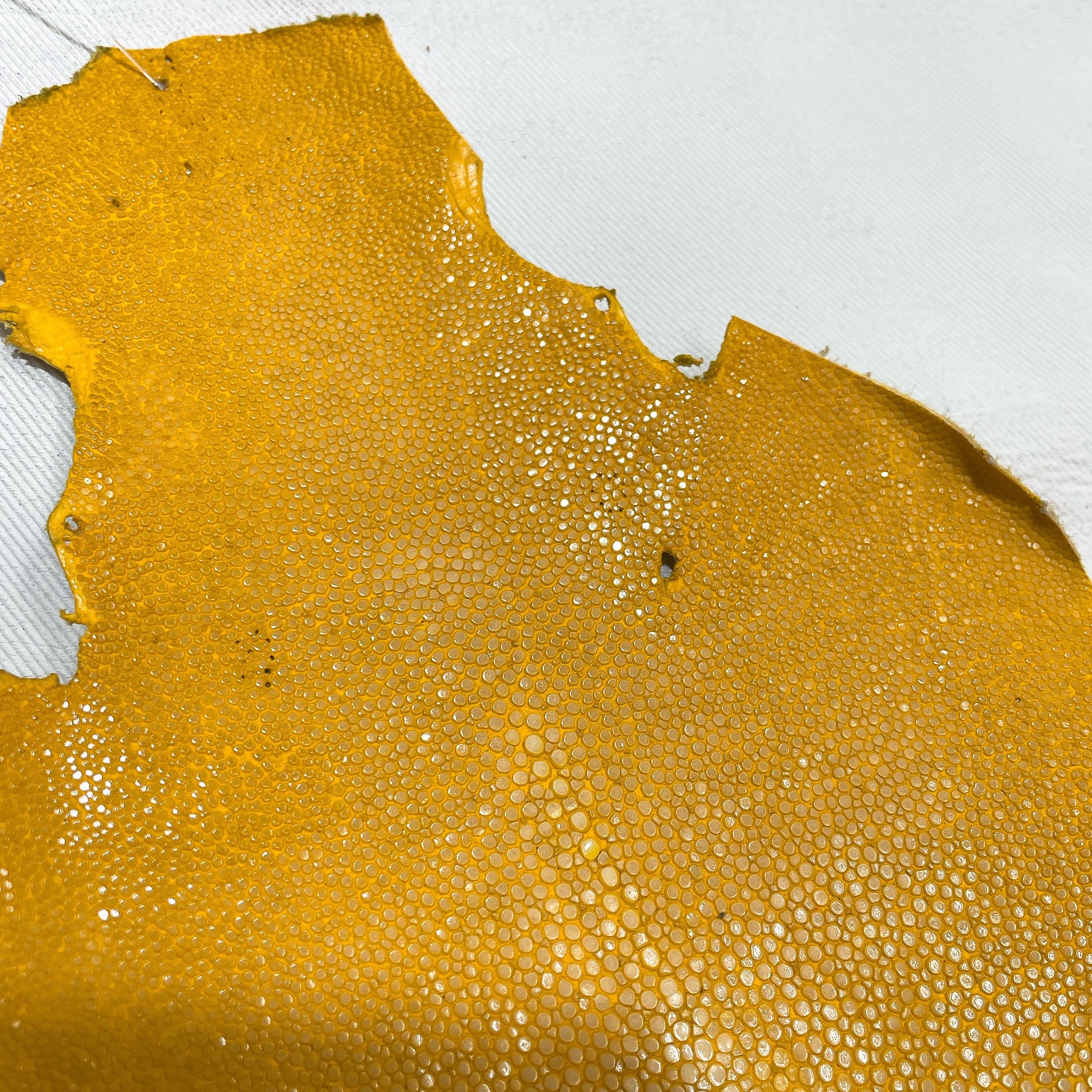 エイ革を含むエキゾチックレザー全般は、牛革や豚革と比べて凹凸が強く、生体由来の小傷や穴、鱗の裏の薄い箇所など、裂けやすい部分が含まれることがございます。