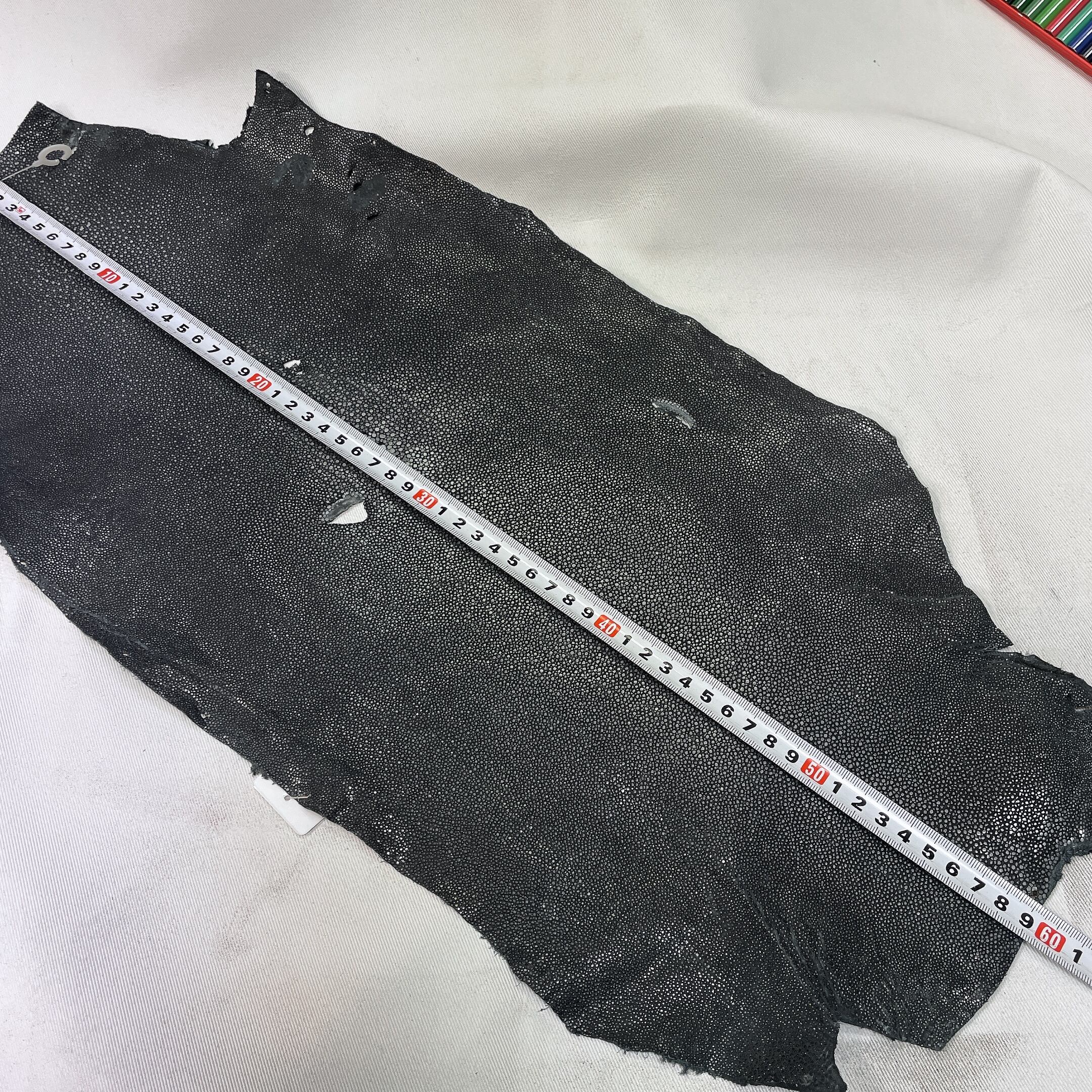 エイ革を含むエキゾチックレザー全般は、牛革や豚革と比べて凹凸が強く、生体由来の小傷や穴、鱗の裏の薄い箇所など、裂けやすい部分が含まれることがございます。