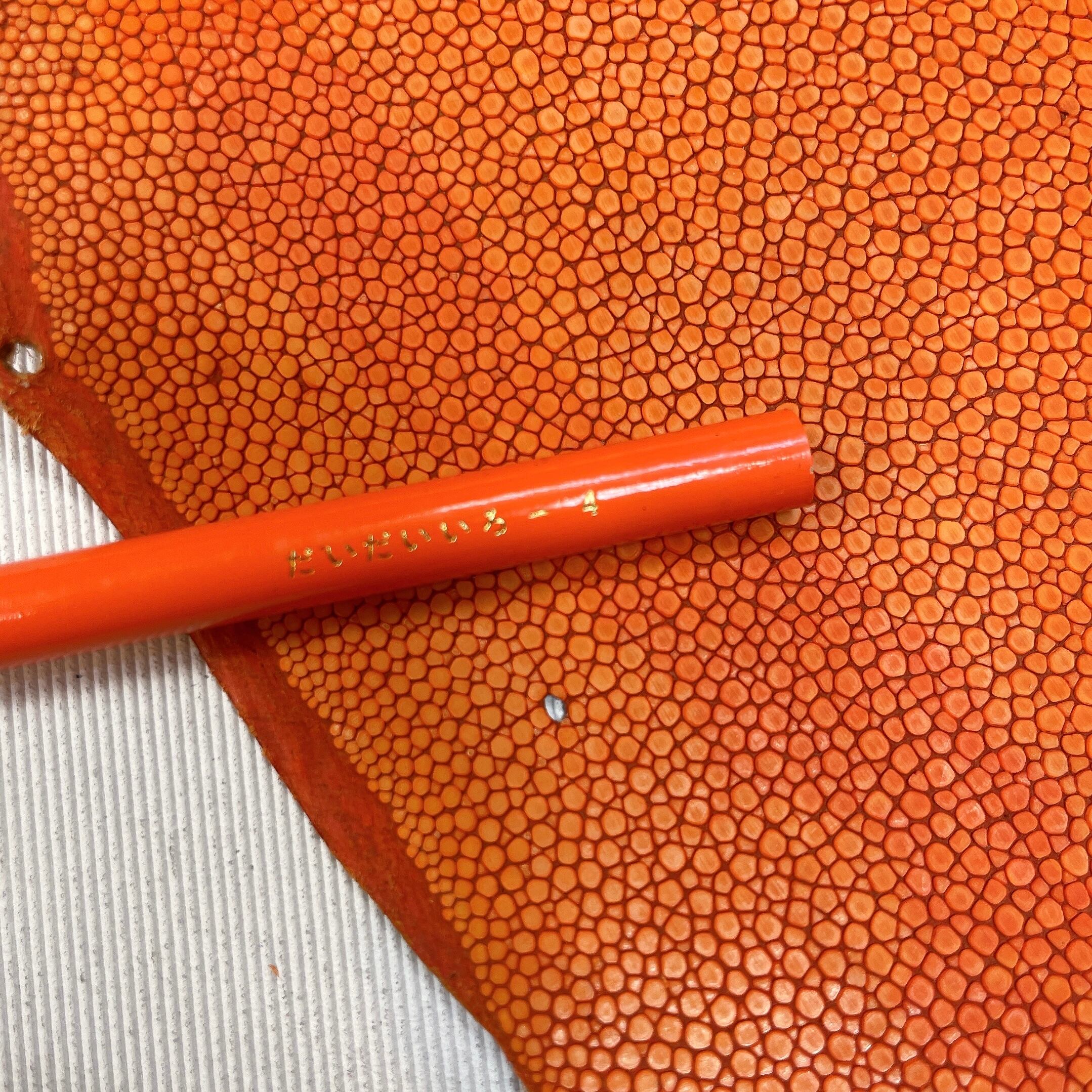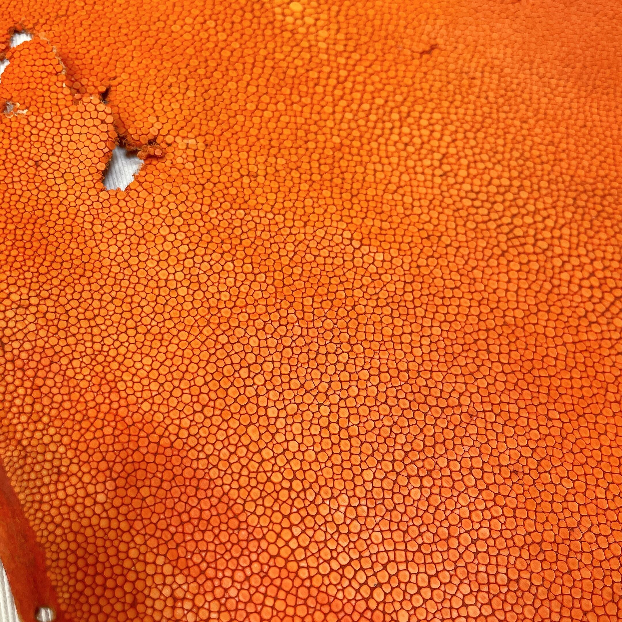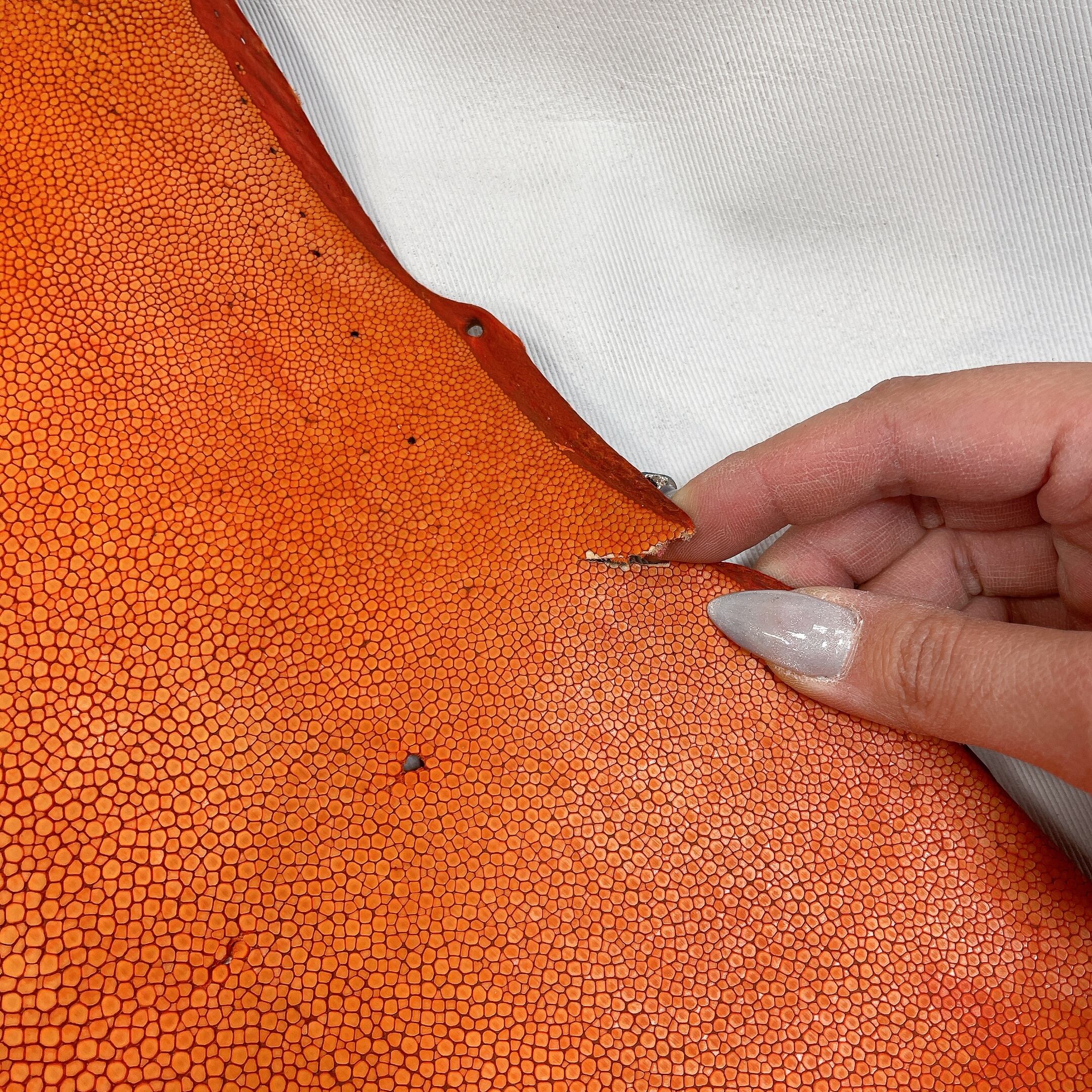 エイ革を含むエキゾチックレザー全般は、牛革や豚革と比べて凹凸が強く、生体由来の小傷や穴、鱗の裏の薄い箇所など、裂けやすい部分が含まれることがございます。